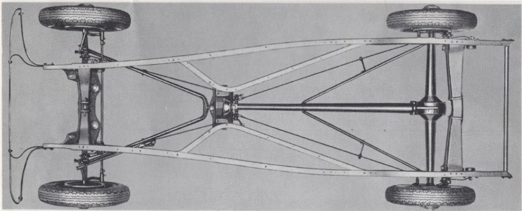 Frame Special Ford design double drop X-type with X-members continuing through to end . of side members; high carbon frame steel. Side rails, 1 ¾ inches wide; depth, 6 inches.