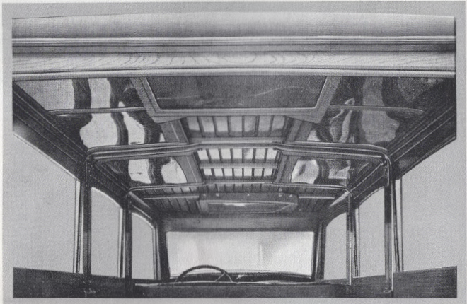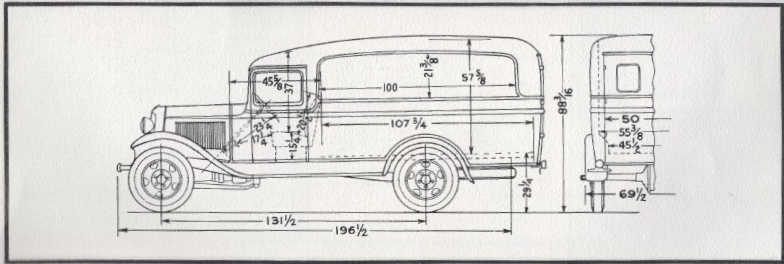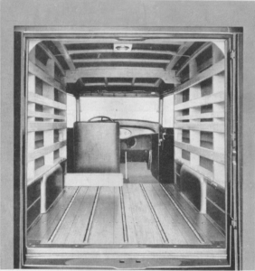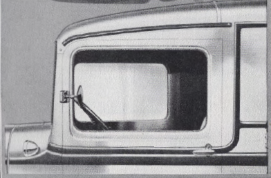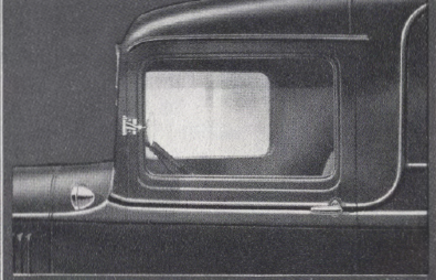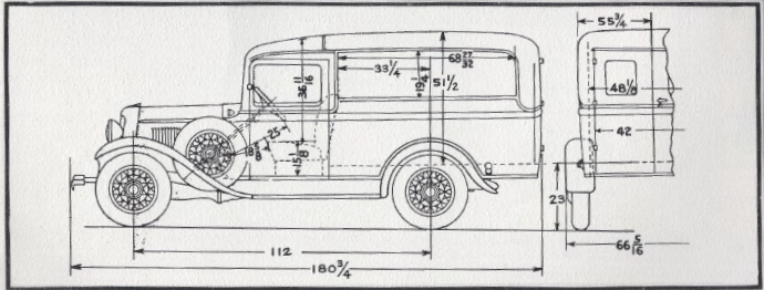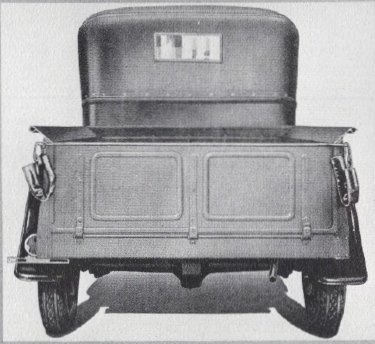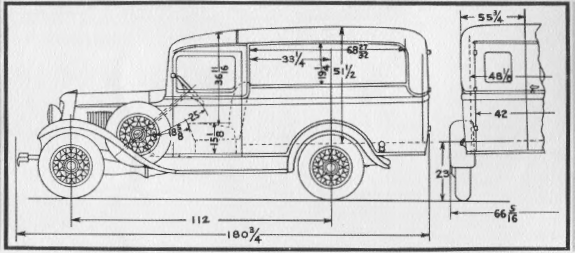 The attractive appearance of the standard panel delivery truck is emphasized by the French roof, the ball windshield header, gracefully moulded rear roof panels and slanting windshield. An additional note of smartness is effected by the fender well spare wheel carrier, which is standard equipment. Unusually large load space. Floor is of hardwood with metal skid strips. Steel panel along sides to top ot wheel housings and hardwood slats to ceiling protect body from loads. Insulating board over heavy wood bows in top. Dome light. Steel rear doors hung in one-piece welded steel frame, thoroughly dust-proofed. Heavy forged hinges permit opening doors 180 degrees. Body has glossy satin finish.