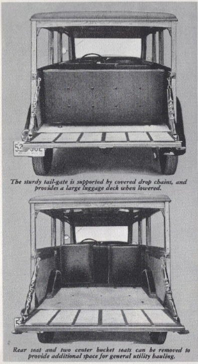 Unusually attractive body lines and passenger car appointments make the new Sedan Delivery Car most desirable for the truly exclusive shop. Yet it is so low in price and costs so little to operate that its field of usefulness is very broad. The neighborhood drug store or market, as well as the smart apparel or flower shop in the downtown location will find it a highly satisfactory delivery car. Its attention commanding appearance, combined with its inherent economy and utility, recommend it to all. Many large organizations have found the Sedan Delivery to be the ideal car for salesmen carrying samples, advertising material or merchandise. The passenger car radiator grille, rust-less steel cowl lights and chromium plated front and rear bumpers mark it as the delivery car of unique distinction.