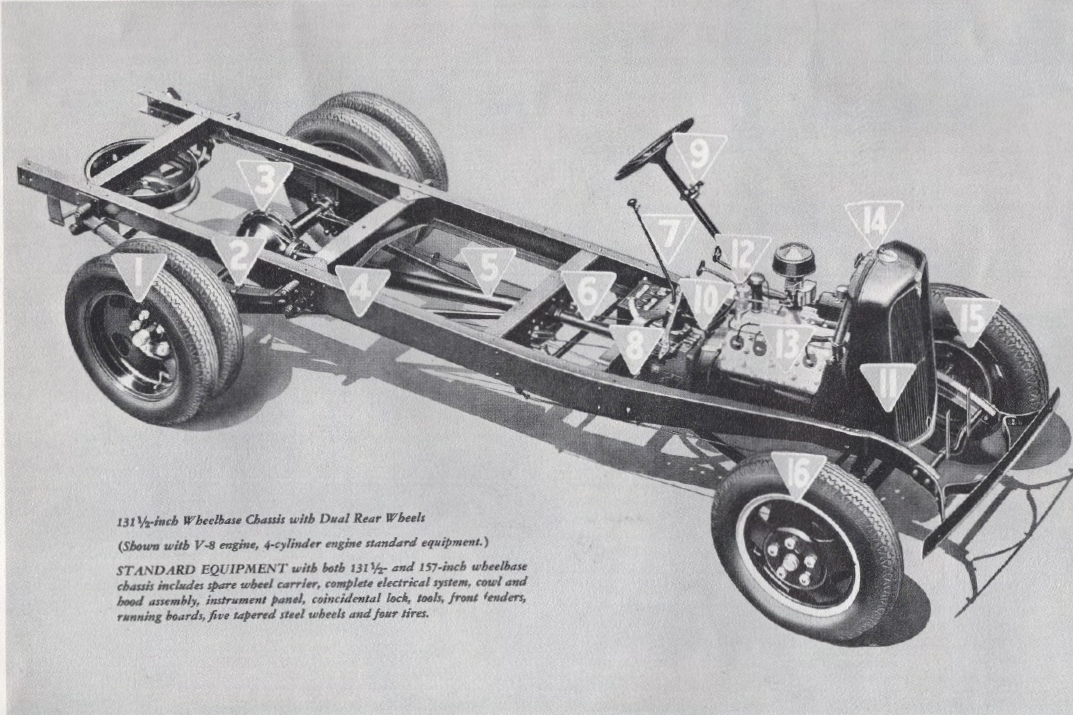 STANDARD EQUIPMENT with both 131 ½· and 157-inch wheelbase chassis includes spare wheel carrier, complete electrical system, cowl and hood assembly, instrument panel, coincidental lock, tools, front lenders, running boards, five tapered steel wheels and font tires.