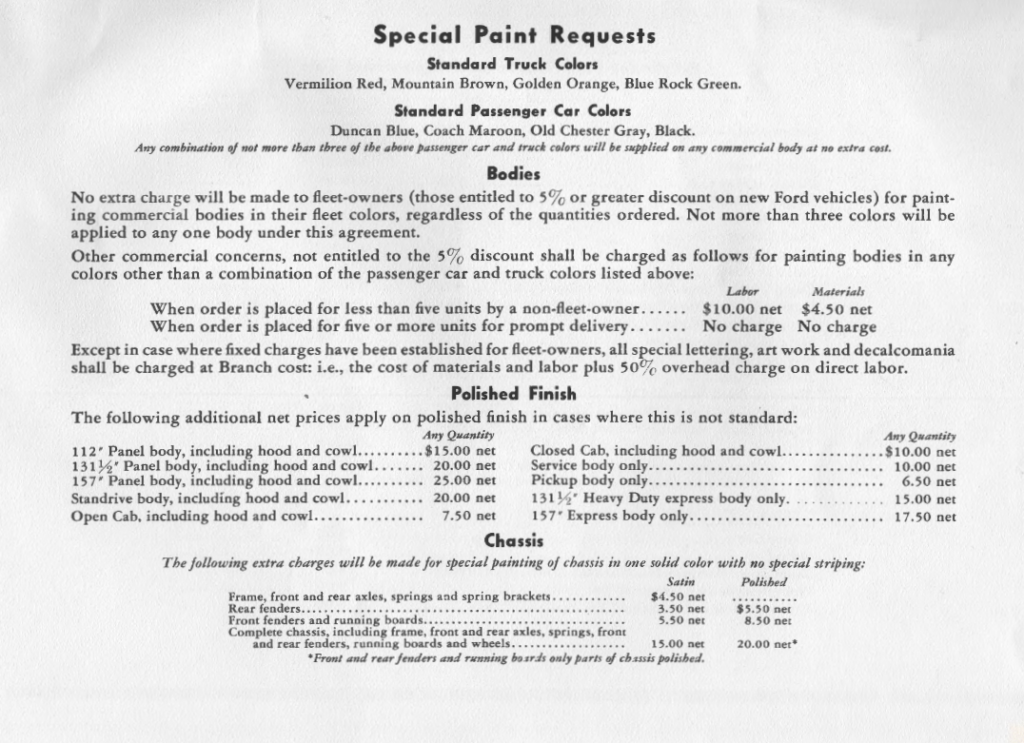 Standard equipment with the commercial car chassis includes: complete electrical system; instrument panel, head and tail lamps; stop light; coincidental steering and ignition lock; tools; five steel spoke wheels; four balloon tires; front fenders; running boards; fender well spare wheel carrier; 14-gallon fuel tank; dash, cowl and hood assemblies.